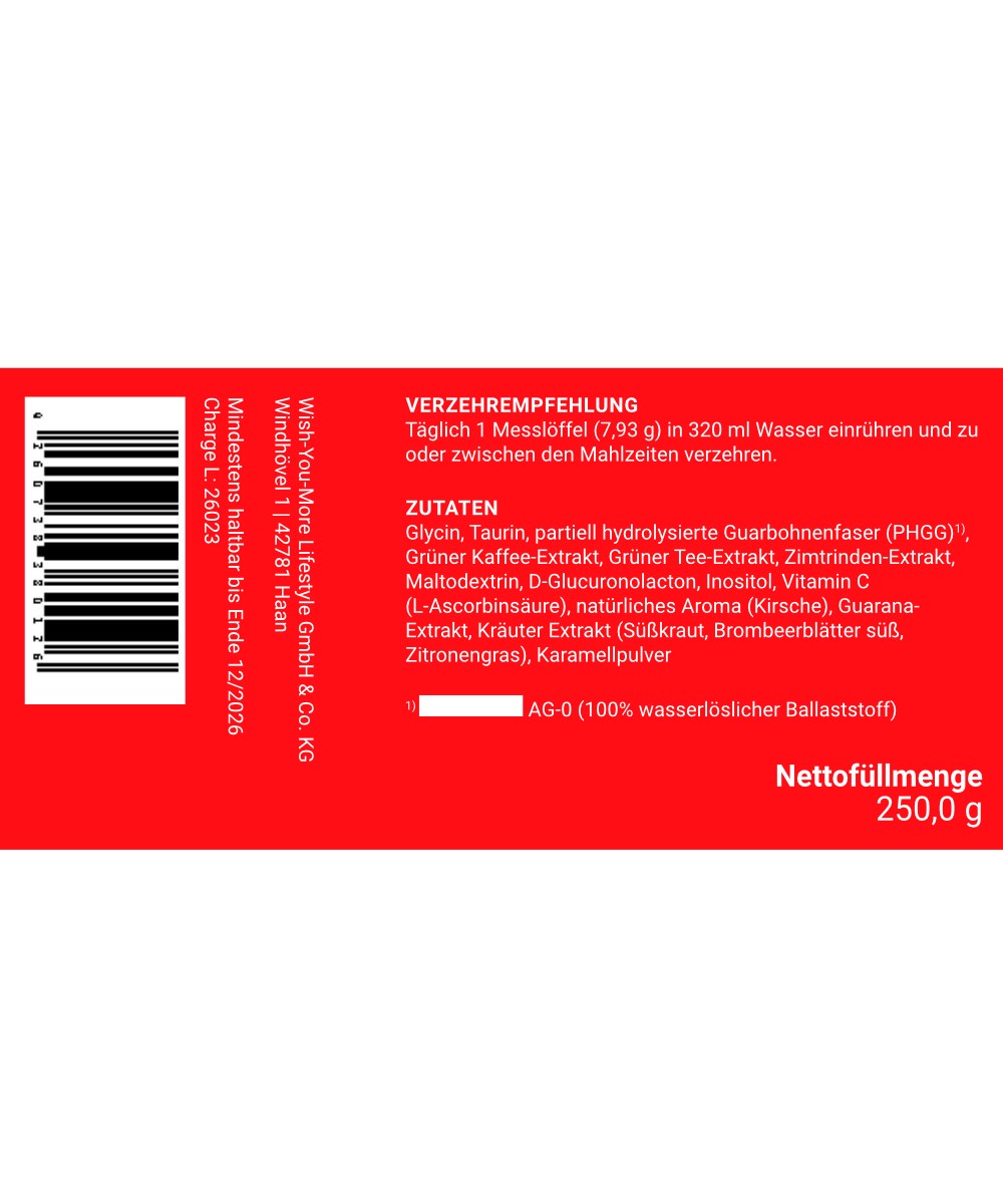 Glycin, taurin, partiell hydrolysierte Guarbohnenfaser (PHGG), Grüner Kaffee-Extrak, Grüner Tee-Extrakt, Zimtrinden-Extrakt, Maltodextrin, D-Glucuronolacton, Inositol, Vitamin C (L-Ascorbinsäure), natürliches Aroma (Kirsche), Guarana-Extrakt, Kräuter Extrakt (Süßkraut, Brombeerblätter süß, Zitronengras), Karamellpulver