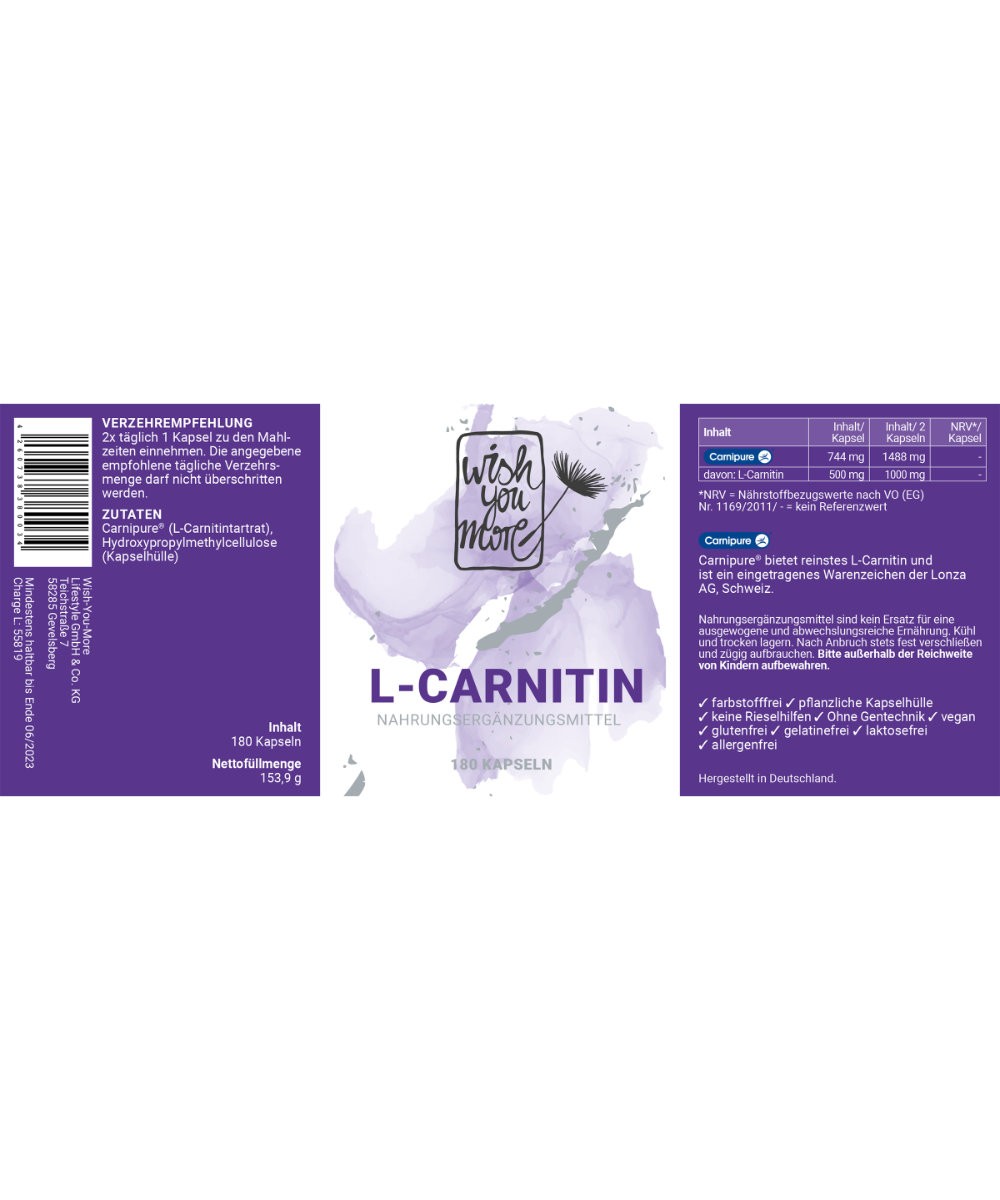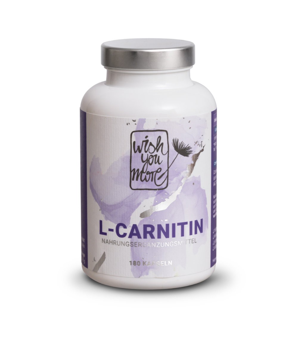 Eine ausgewogene und nährstoffreiche Ernährung unterstützt die Energieversorgung jeder Zelle unseres Körpers. L-Carnitin nimmt dabei eine zentrale Rolle im Energiestoffwechsel ein. Das Ganze funktioniert so: Mit Hilfe von L-CARNITIN werden Fettsäuren in das Innere der Mitochondrien transportiert, wo sie zu Energie, in der Form von ATP (Adenosintriphosphat), verstoffwechselt werden. Der Körper kann L-Carnitin auch selbst herstellen. Es wird im Körper in einem mehrschrittigen Prozess aus Lysin und SAM (S-Adenosylmethionin) hergestellt. Die Menge, die synthetisiert werden kann, wird auf 16-20mg pro Tag geschätzt. Wichtige weitere für die Synthese notwendige Faktoren sind Vitamin C, B3, B6, B12, Folsäure und Eisen. Auch ein Mangel an Riboflavin (Vitamin B2) kann die L-Carnitin-Synthese hemmen. Unser Wish-You-More L-CARNITIN enthält den Qualitätsrohstoff Carnipure™. Carnipure™ ist eine Marke der Lonza Schweiz und steht für höchste Produktionsstandards, Rohstoffqualität und Reinheit von L-Carnitin seit 25 Jahren. L-Carnitintartrat ist eine natürliche Substanz der Marke Carnipure®. Hohe Bioverfügbarkeit. Vegan, Laborgeprüft, ohne Zusatzstoffe. Carnipure™ steht für höchste Produktionsstandards, Rohstoffqualität und Reinheit von L-Carnitin. 180 Kapseln pro Dose. 500 mg L-Carnitin pro Kapsel.