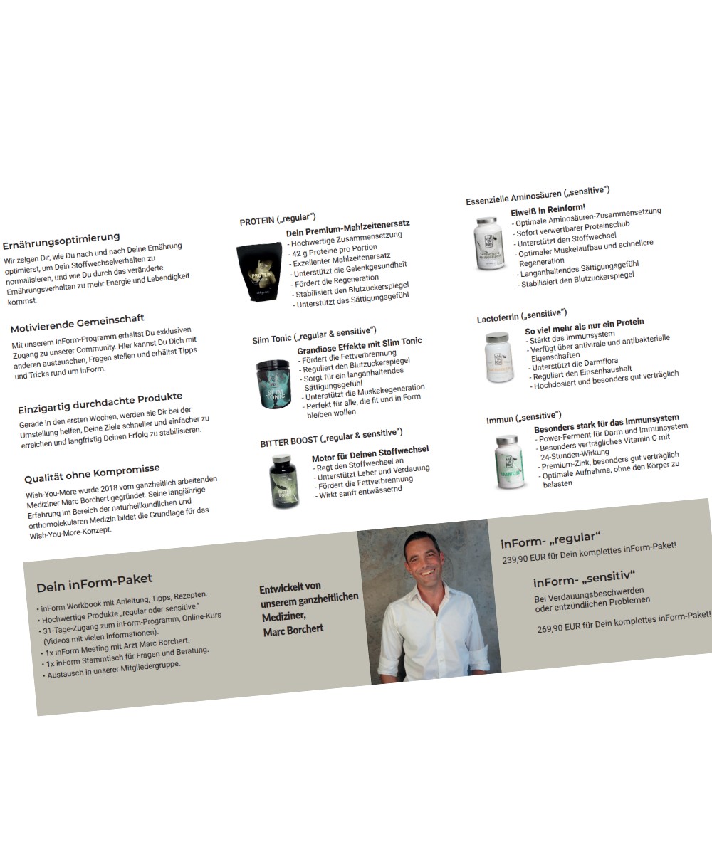 Info Flyer zum Wish-You-More Stoffwechseprogramm "inForm". Mit Kurzbeschreibung und Produktinformationen.